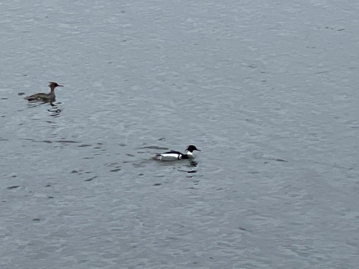 オスは黒白灰の三色の目立つ出で立ちをしており、メスは保護色のように目立たない外見だ。ひょっとしてこれがカワアイサかと思いスマホでググると、どうやらウミアイサのようだ。ともにカモの仲間なのだが、いくつかの明瞭な違いがあるとのこと
