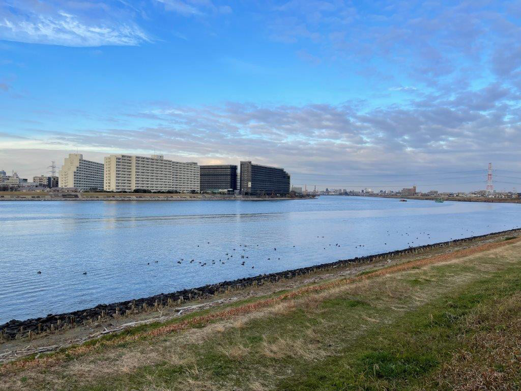 こちらは旧江戸川の河口。奥が上流で、左手方向の少し先が東京湾。川面に鳥の群れがいた。よく見るとオオバンとヒドリガモの群れだ。ともに冬鳥だ(越冬のために北から南下する渡鳥)。この2種類の鳥はこの辺りでよく見かける