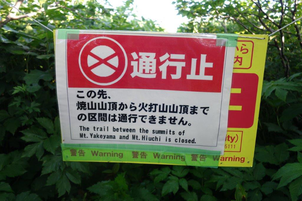 影火打山から先に進むと、何と通行禁止。火山活動による焼山の入山規制は解除されているはずなのに・・・。小屋に戻って聞いたら、事前に申請して許可を得たら通行できるとのこと。道理で人が入らず、荒れ放題になっているわけだ。それにしても何でこの看板は影火打山を越えたところにあるのだろう。火打と焼山の間が通行禁止なら、火打山頂から影火打方面へ向かう登山道入り口に掲示してくれればよいのに
