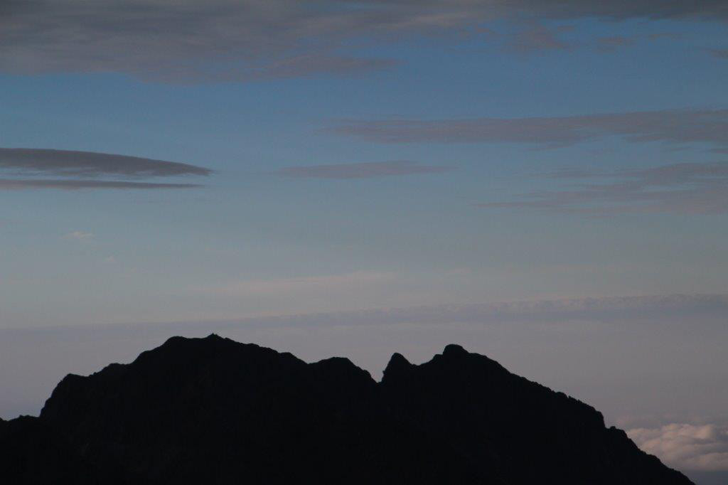 二日目の黎明の時間帯。左の黒い部分が穂先のシルエット。部屋の窓から眺める贅沢