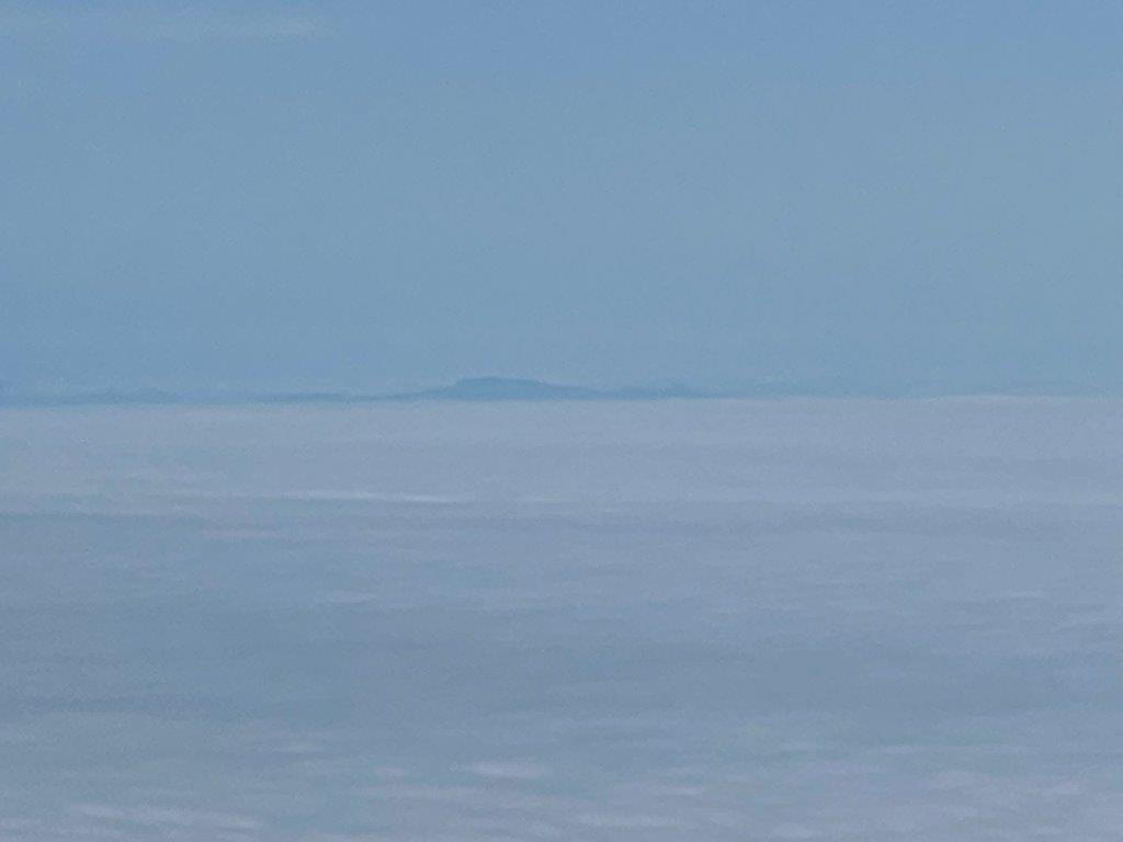 6合目の第一展望台から振り返れば、写真中央にポン山、その背後に礼文島が見える。完璧な快晴なのだが、海にへばり付くような低い雲は終日かかっていて、雲海を形成していた