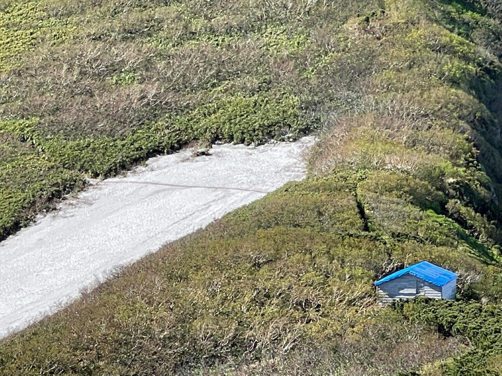 8合目の長官山から一旦下って避難小屋へと向かう、その先で雪渓をクロスする