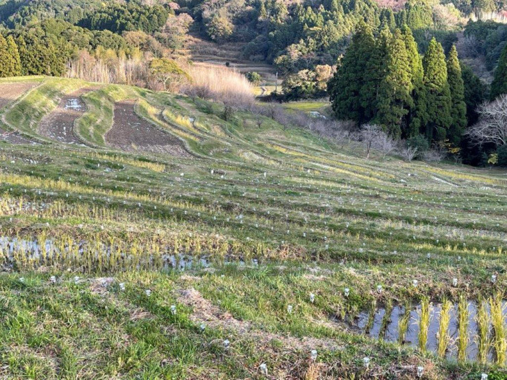 この時期は夕方から夜にかけて棚田のライトアップが行われている(10月下旬から1月上旬まで。夕暮れから3時間程度)。上の写真で、畦に等間隔で並んでいるのがLEDライトだ。4色が次々に変わっていくとか